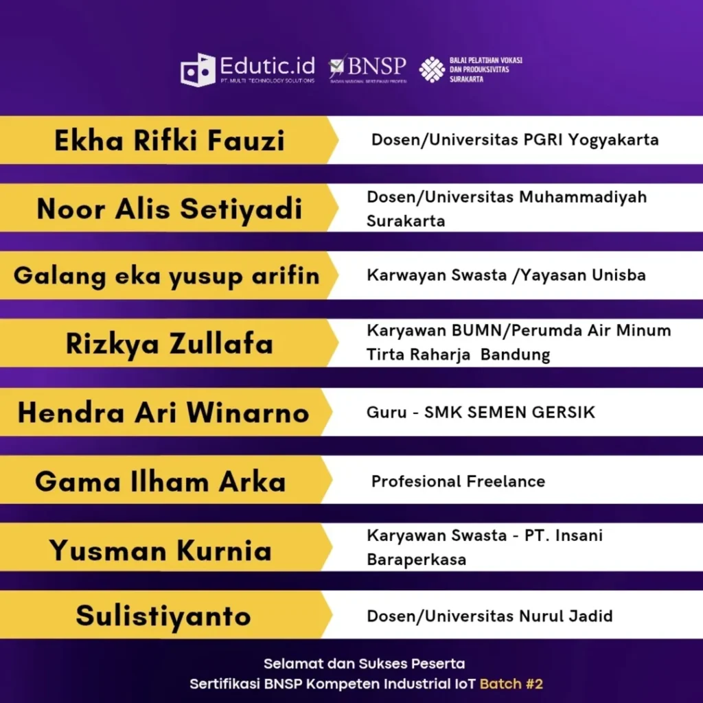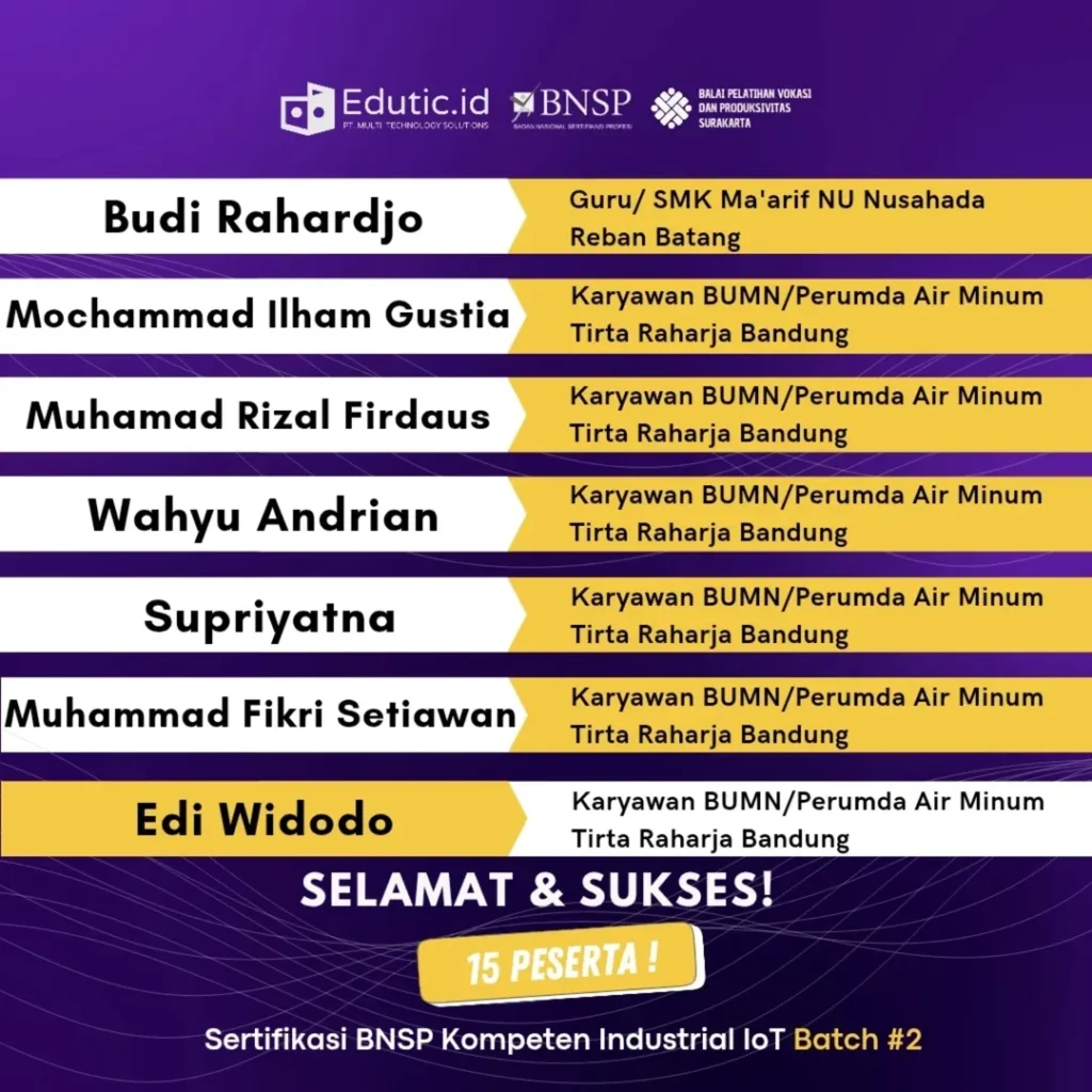 Bergabunglah dengan ratusan profesional yang telah meningkatkan kompetensi mereka di bidang Industrial IoT bersama Edutic Academy.