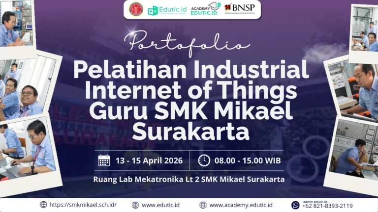 Tenaga pendidik SMK Mikael Surakarta sukses melaksanakan Pelatihan Industrial Internet of Things bersama Academy Edutic.id pada 13-15 April 2026. Kegiatan ini diselenggarakan secara luring (Offline) di laboratorium mekatronika.