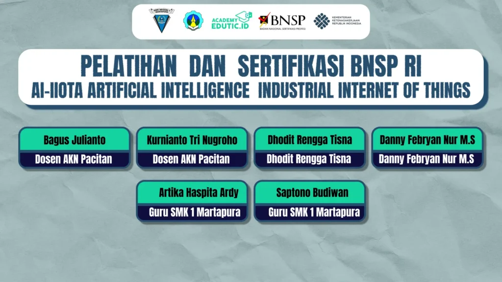 Academy Edutic.id menyelenggarakan Pelatihan dan Sertifikasi BNSP RI sebagai upaya meningkatkan kompetensi Sumber Daya Manusia serta keterampilan di bidang Transformasi Digital dan Industrial IoT 4.0. Kami mengundang para dosen dan praktisi untuk berpartisipasi dalam kegiatan “Training dan Sertifikasi” Artificial Intelligence Industrial Internet of Things (AI-IIoT).